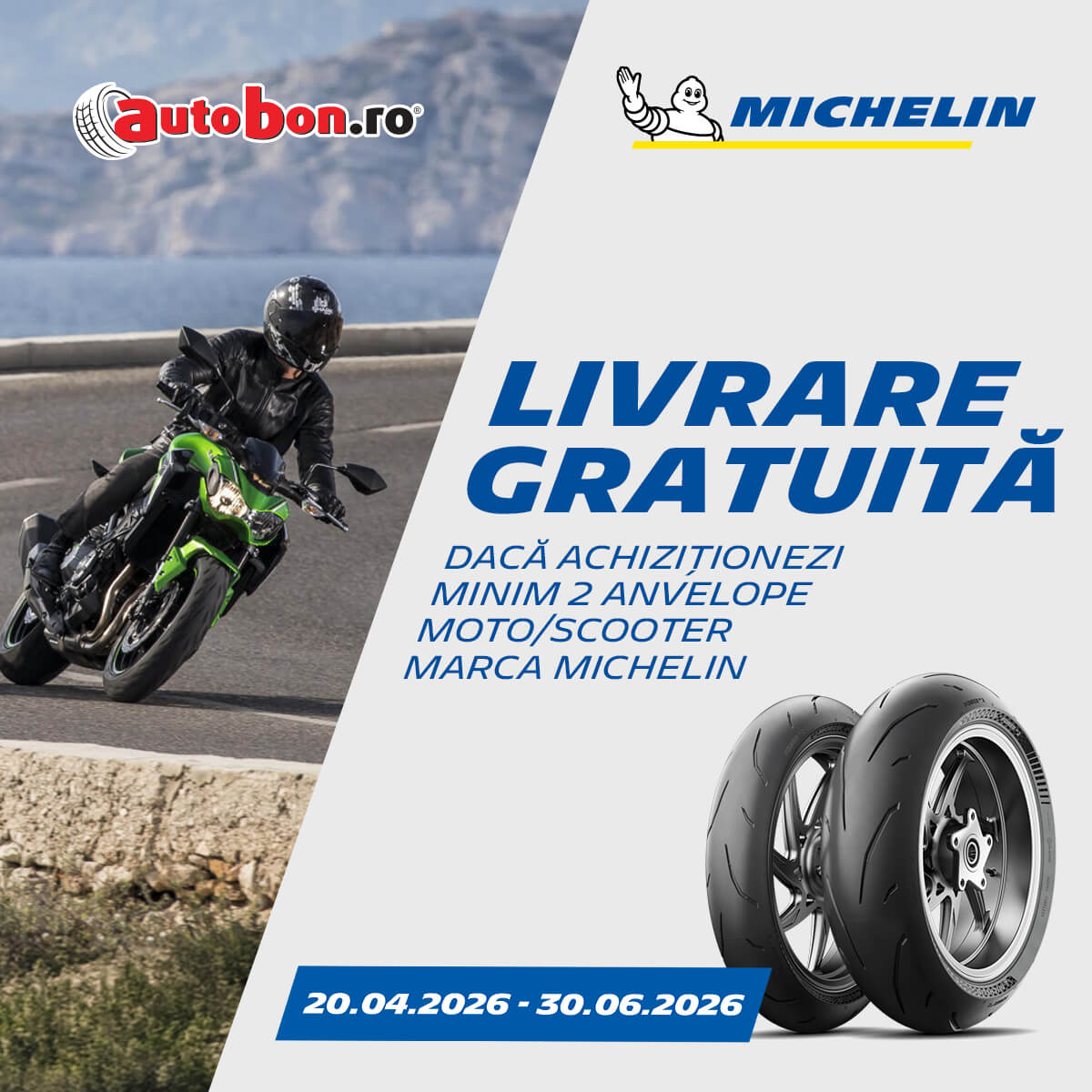 În perioada 20 aprilie - 30 iunie, pentru achiziția a minimum 2 anvelope marca Michelin moto sau scooter, beneficiezi de livrare gratuită.